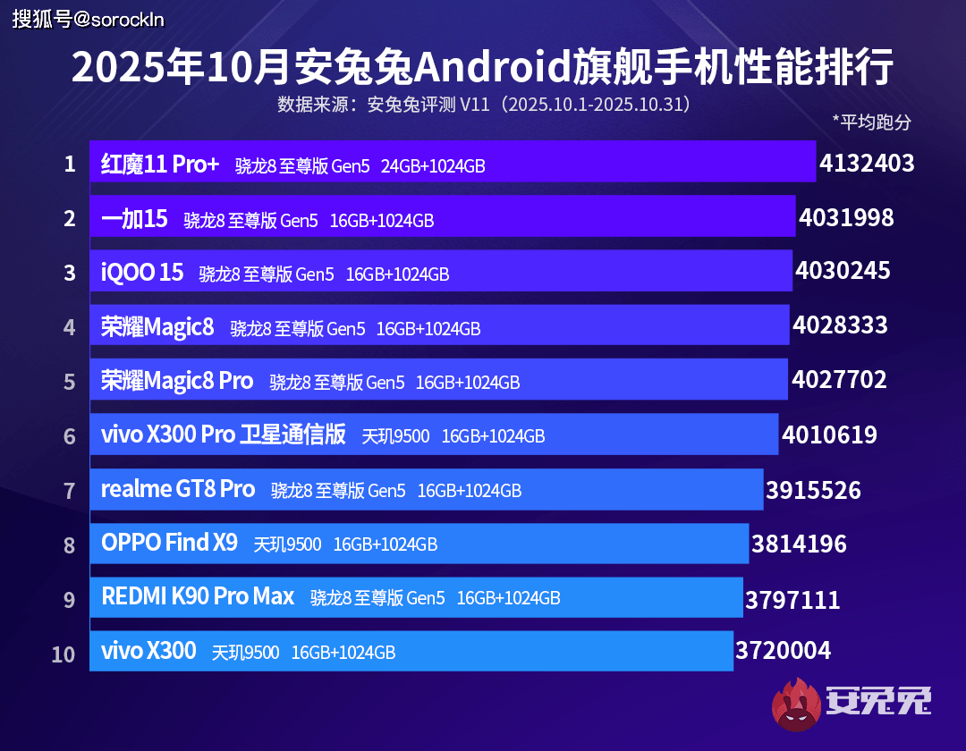 从榜单排名可以看出,今年的天玑9500明显不如骁龙8至尊版5代,且差距极为明显。更让人意外的是小米17系列三款手机竟然没有一款手机上榜。