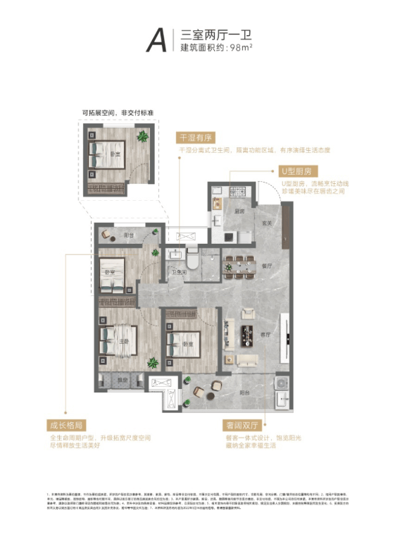 成长型户型设计是项目的另一大核心亮点,精准适配家庭全生命周期需求。从二人世界的两居室到三代同堂的四居室,每一款户型都具备灵活改造空间,可随家庭结构变化调整功能布局,避免频繁换房的麻烦与成本;户型设计融入家庭友好型细节,如儿童安全防护、老年便捷设施、多重储物空间等,充分考虑不同家庭成员的使用需求,让居住更舒适、更安心。成长型户型不仅提升了居住的实用性,更增强了房产的市场竞争力与保值增值潜力,成为家庭长期居住的理想选择。