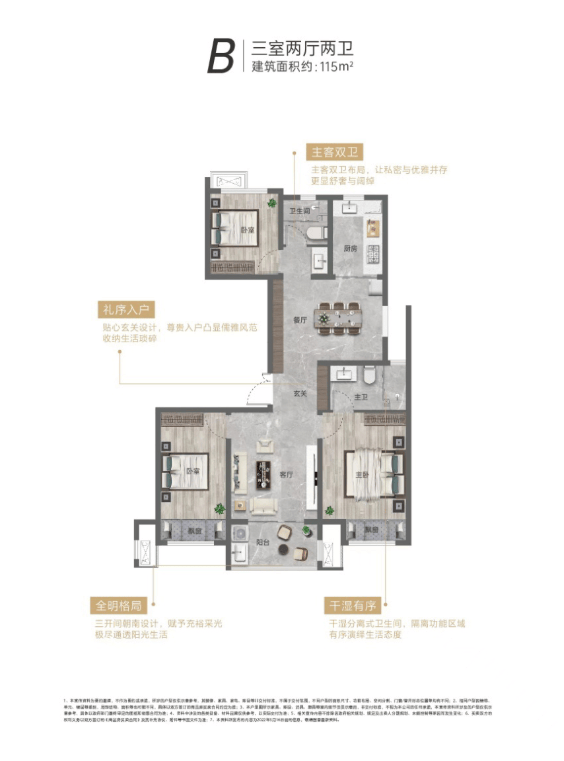 三居室户型面向改善家庭,建筑面积适中,空间布局更加开阔合理,注重居住的舒适度与功能性。户型采用动静分区的设计理念,将客厅、餐厅、厨房等公共活动区域与卧室、书房等私密休息区域严格分离,既保证了公共区域的活动不受干扰,又保障了私密区域的安静与舒适。客厅开间阔绰,搭配南向全景阳台,采光通风极佳,视野开阔,能够俯瞰社区园林景观,是家庭聚会、休闲娱乐的核心场所;餐厅与客厅相连,形成一体化的开放空间,同时与厨房形成便捷的动线,聚餐时上菜方便快捷。主卧采用豪华套房设计,配备独立卫生间、衣帽间与观景飘窗,为业主提供了私密、舒适、尊贵的居住体验;独立卫生间采用干湿分离设计,使用便捷,提升了居住的舒适度;衣帽间设计满足了业主的衣物收纳需求,让衣物摆放更加整洁有序。两个次卧空间宽敞,采光良好,可根据家庭需求分别布置成儿童房与长辈房,儿童房临近主卧,方便父母照顾孩子;长辈房远离公共活动区域,安静舒适,适合长辈休息。书房空间静谧,采光充足,是办公学习、修身养性的理想场所,也可根据需求改造成客房,满足亲友来访的居住需求。厨房采用 U 型布局,操作空间宽敞,储物空间充足,能够容纳多人同时操作,提升了烹饪的趣味性与效率;公共卫生间干湿分离,配备优质卫浴洁具,满足家庭日常使用需求。