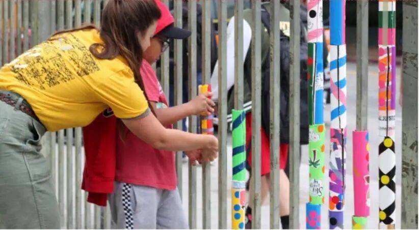 在“可玩城市”对城市空间的互动转化实践中,往往通过对基础设施的情感化与游戏化升级,消解空间的社会阻隔,提升公共服务的体验温度。在洛杉矶的西湖社区,位于其中的拉斐特公园与周边社区被一道围栏分隔,导致公园内丰富的设施活动与周边社区缺乏维护的人行道形成鲜明的感官对比,为了打破围栏两侧的割裂感,其设计了“围栏万花筒”的装置艺术游戏,邀请社区内的孩子们用彩色胶带和贴纸自由发挥装饰纸筒,然后剪开并套在公园入口附近公交车站旁的围栏上,以前乘客下车时只能面对一堵围栏,而通过游戏化的微介入改造,迎接乘客和行人的是一系列装饰手作,为他们每天的通勤路增添个性化的场地感。在这一过程中,孩子们用普通材料和手工创造亲手为日常环境增添活力和吸引力,使这个集体创作的过程也成为一场分享关怀的社会活动。