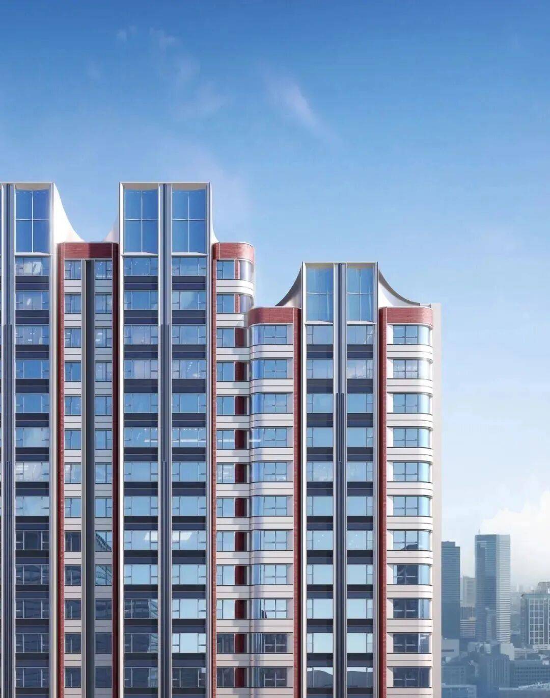 不管住宅还是会所,都堪称美学地标,其中住宅立面选用珍珠蓝、香槟金、海派砖红等鲜明色彩,搭配约270°圆弧造型,昭示性特强。