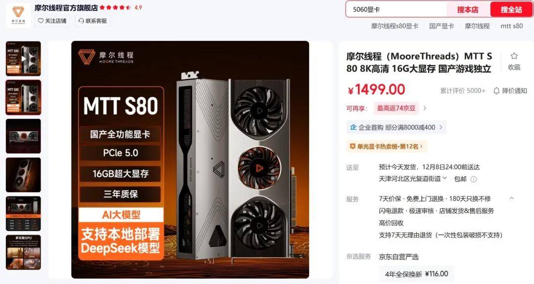 说实话这个数据并不能让游戏党们满意,特别是GTX3060在2021年的首发价格只有2499元,在两年后MTT S80发布时价格更是降至2000元出头,低了近三分之一。这也让摩尔线程的首款产品发布即遇冷。甚至截止到2025年12月,MTT S80在京东平台的三年销量只有6000多台、并且价格已经降至1499元。